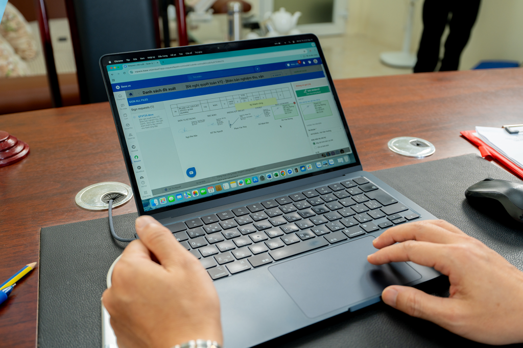 “Trước kia, chúng tôi phải cầm từng bộ hồ sơ đi tìm người ký. Do khu vực văn phòng và tổ sản xuất cách xa nhau, việc hoàn tất đủ chữ ký có khi mất 2-3 ngày. Chỉ cần thiếu một chữ ký, quy trình đã bị chậm trễ, gây lãng phí thời gian.” anh Thành nói.